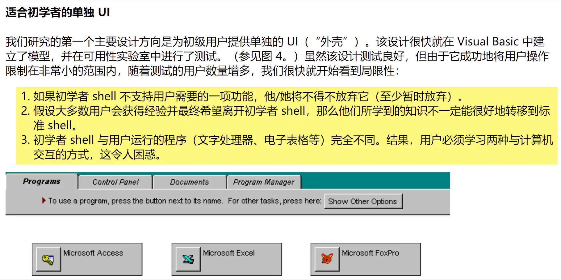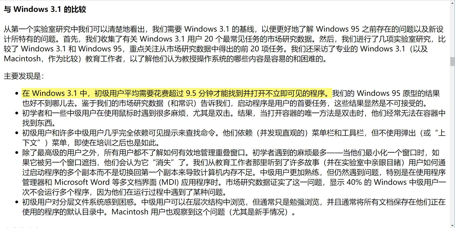 Windows 3.1 的测试结果并不乐观。新手用户平均需要花费超过 9.5 分钟才能在 Windows 3.1 中找到并打开一个不立即可见的程序。而且除了高水平用户之外,所有用户都不了解如何有效地管理重叠窗口。改进迫在眉睫。