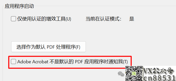 打开首选项,选择一般,在应用程序启动选项中点击选择作为默认PDF处理程序即可将Adobe DC软件设置为PDF默认程序,如下图: