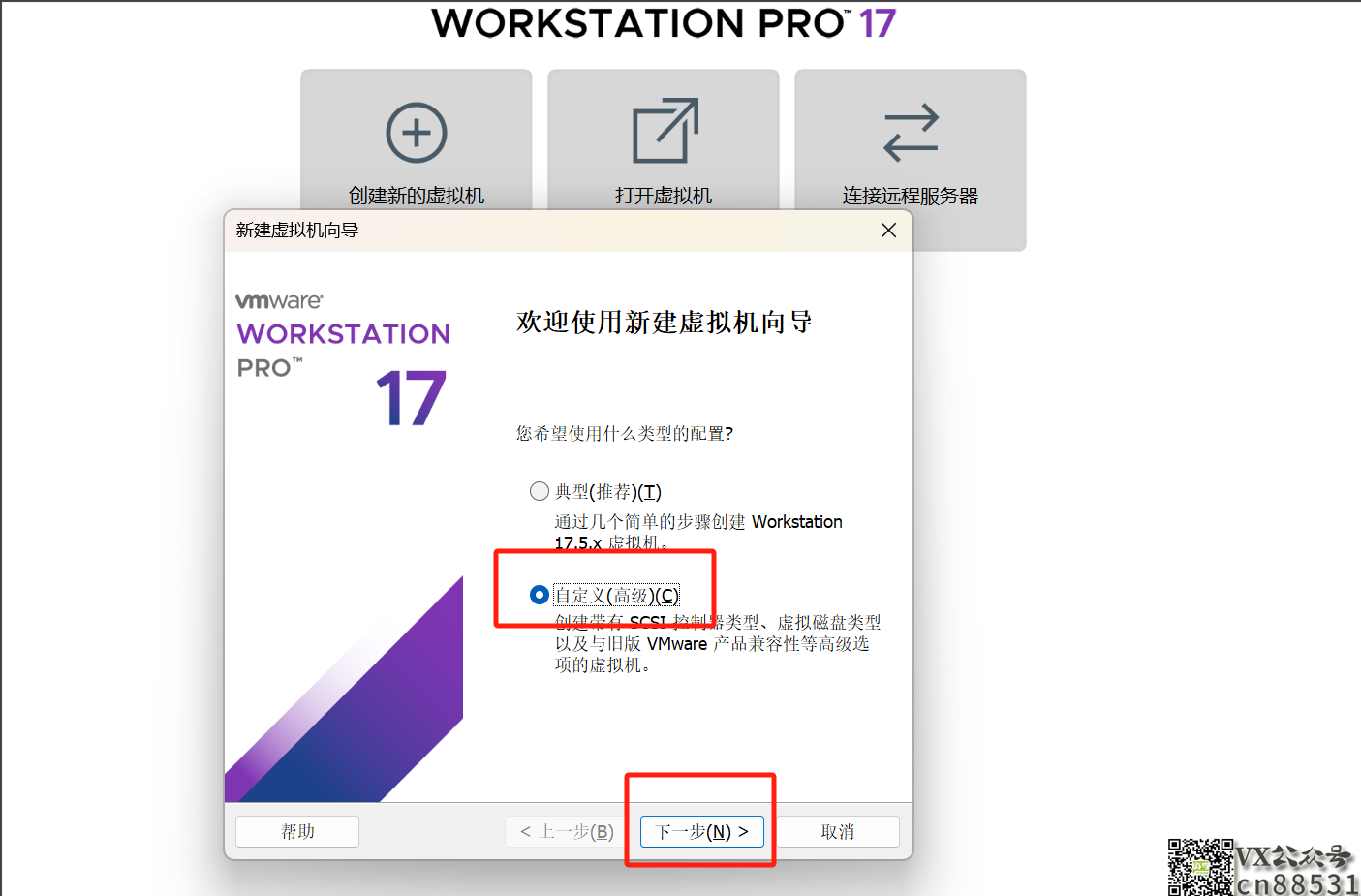 打开VMware虚拟机,「文件 → 新建虚拟机 → 自定义 → 下一步」。