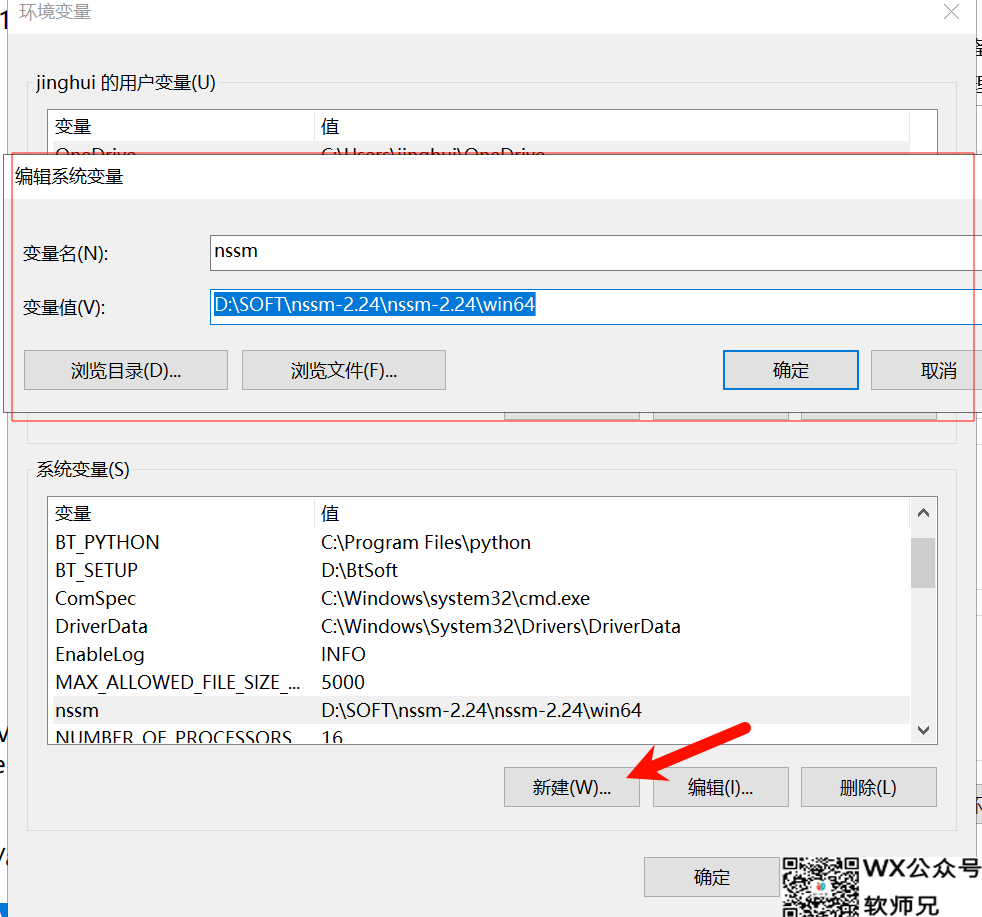 将 nssm 解压之后,将所在的路径(比如 D:\Program Files\nssm-2.24\win64)添加到系统环境变量,确保可随处执行 nssm。