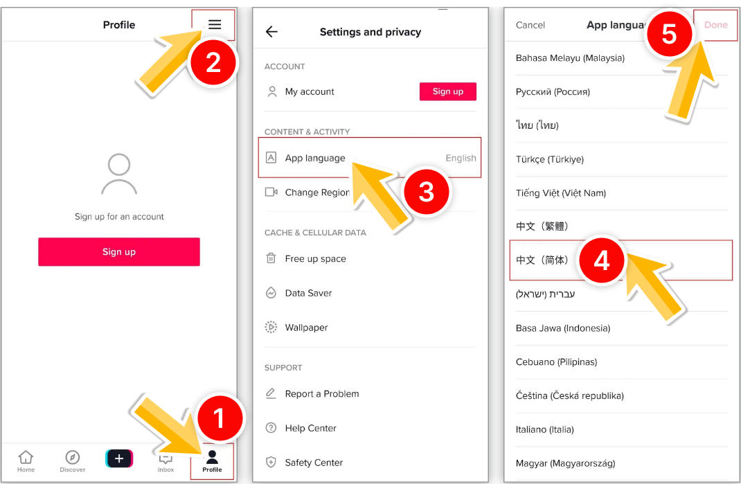 第三步:由于是国际版,首次打开显示的是英文,我们需要设置成简体中文使用,依次点击:Profile-右上角三横-App language-中文(简体)-Done,即可转换。