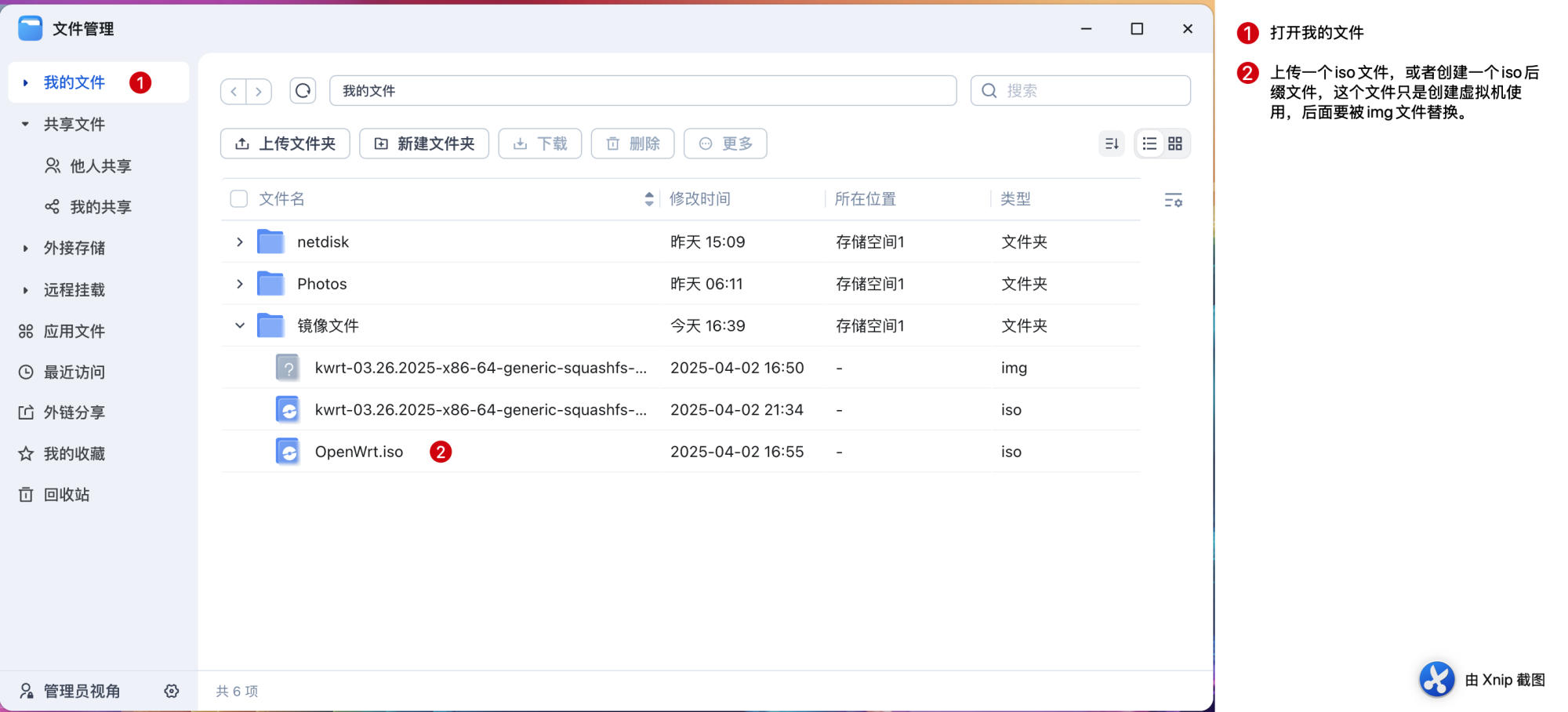 - 在飞牛文件管理创建一个名为ISO的文件夹,上传一个.ISO文件,或随便上传一个文件改后缀后.ISO,因为我们装的是.IMG镜像系统,实际用不到ISO文件,因为飞牛虚拟机创建的时候必需选一个ISO才能下一步。