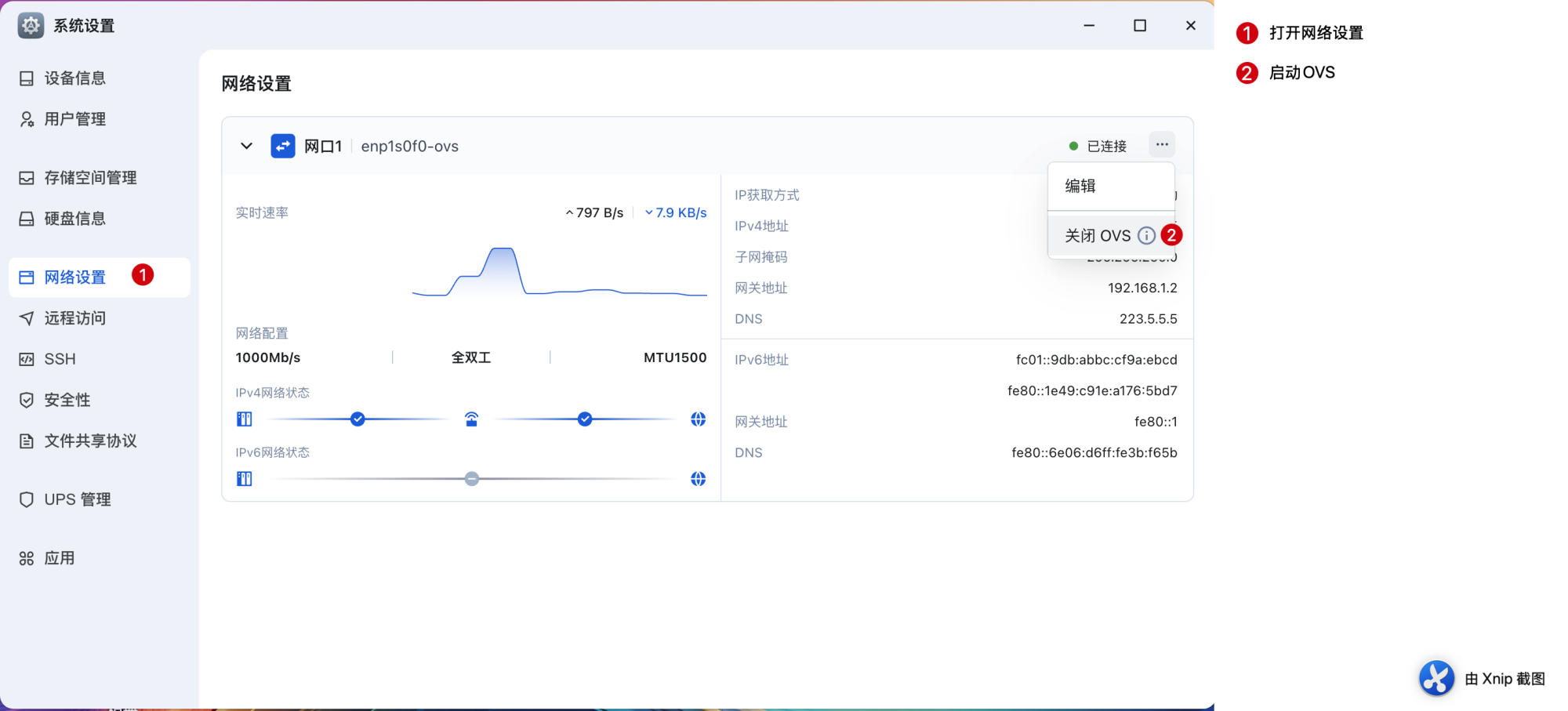 - 在飞牛OS系统设置>>网络设置>>打开虚拟机要用到的网口的OVS功能。
