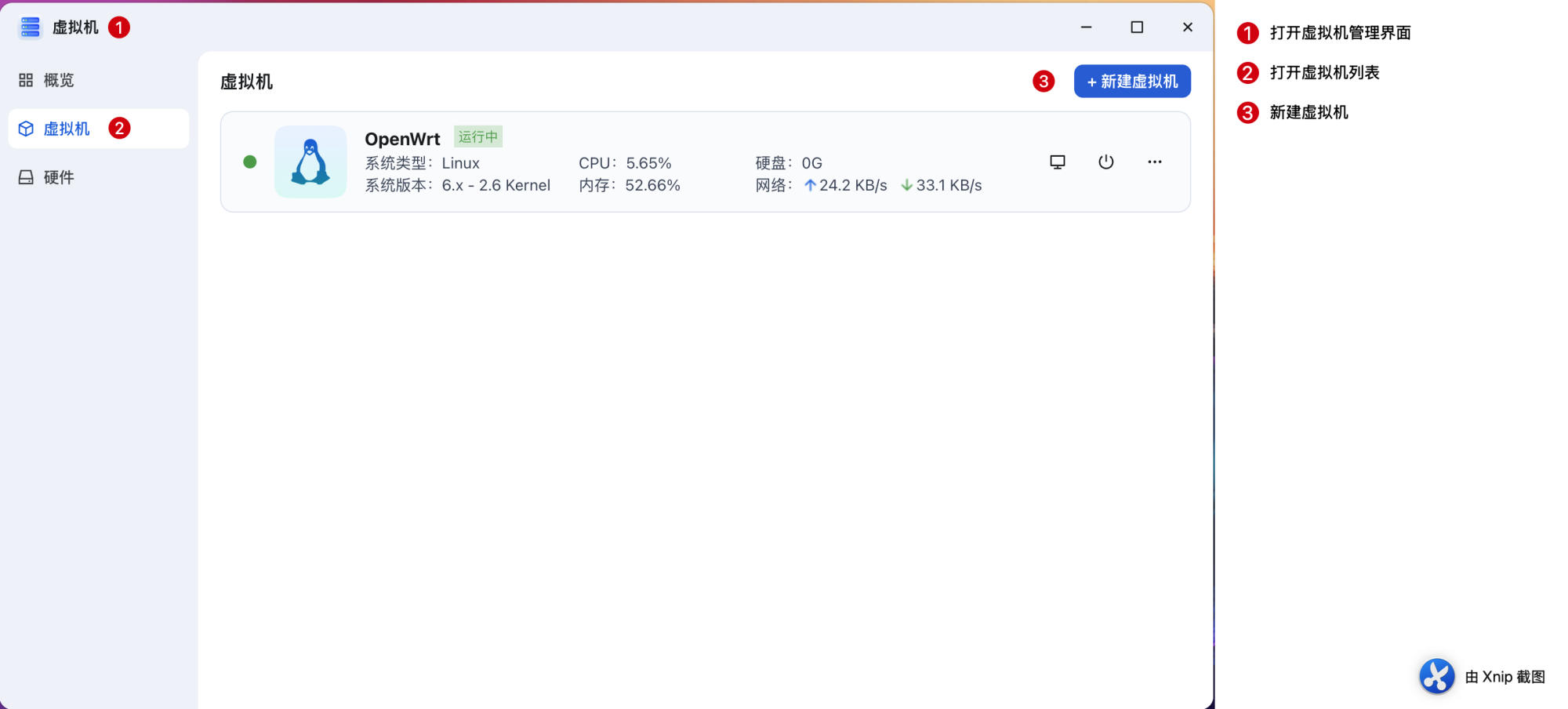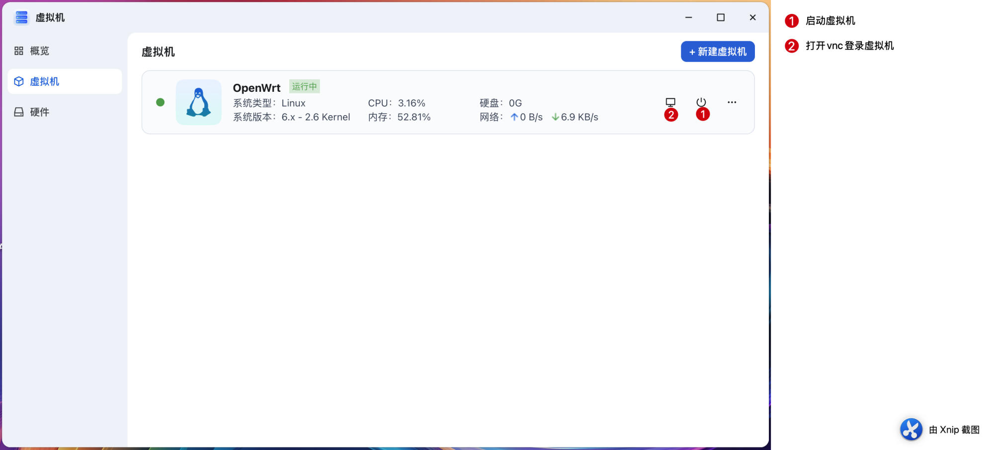 - 返回虚拟机管理界面,启动新建的openwrt虚拟机。