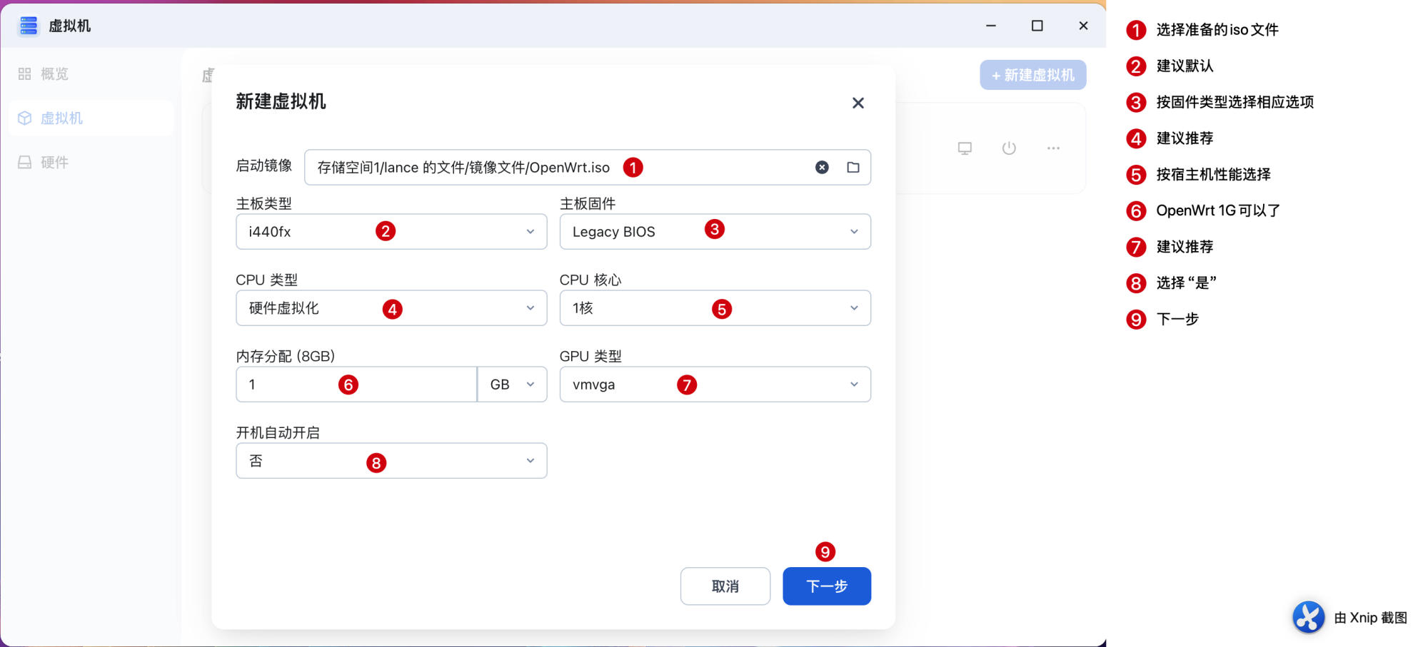 - 选择准备的iso文件,按需求分配资源,建议设置开机启动