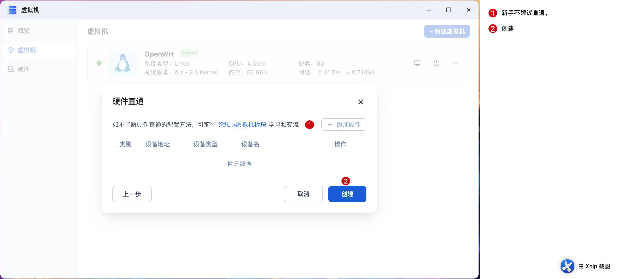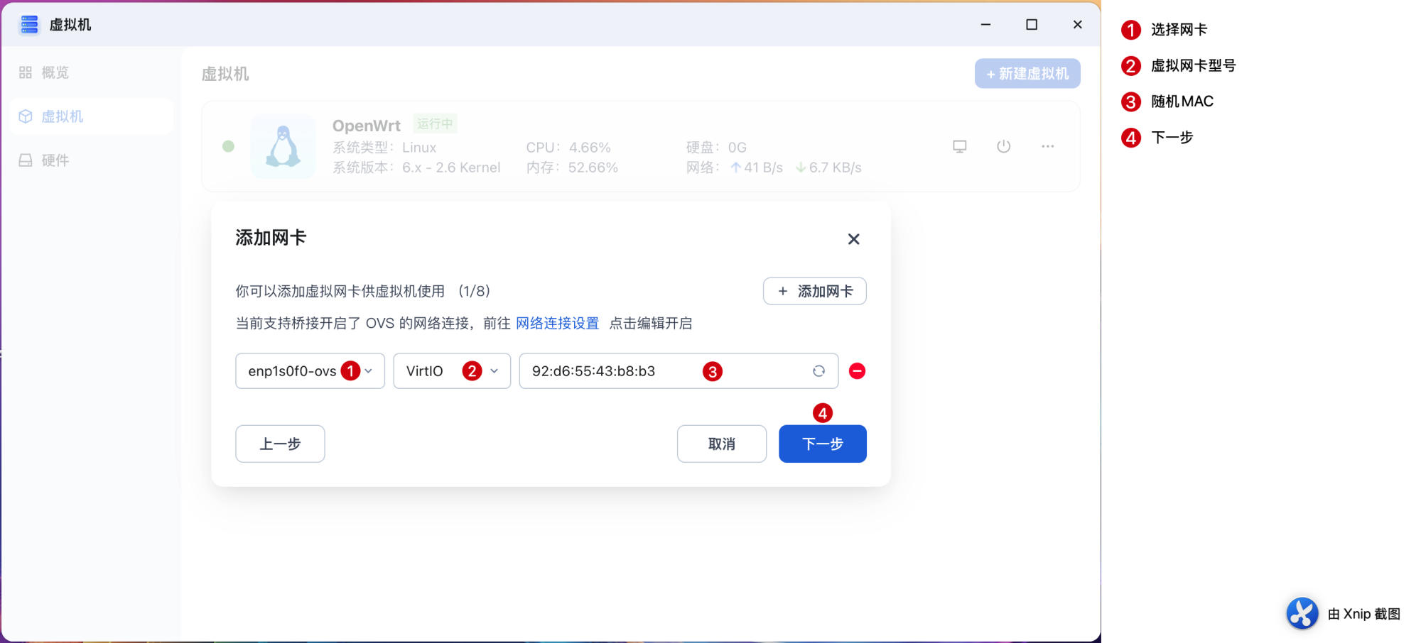 - 添加OVS网口,如果已经开启硬件直通可以删除并跳过这一步,在下一步里添加物理网口即可。