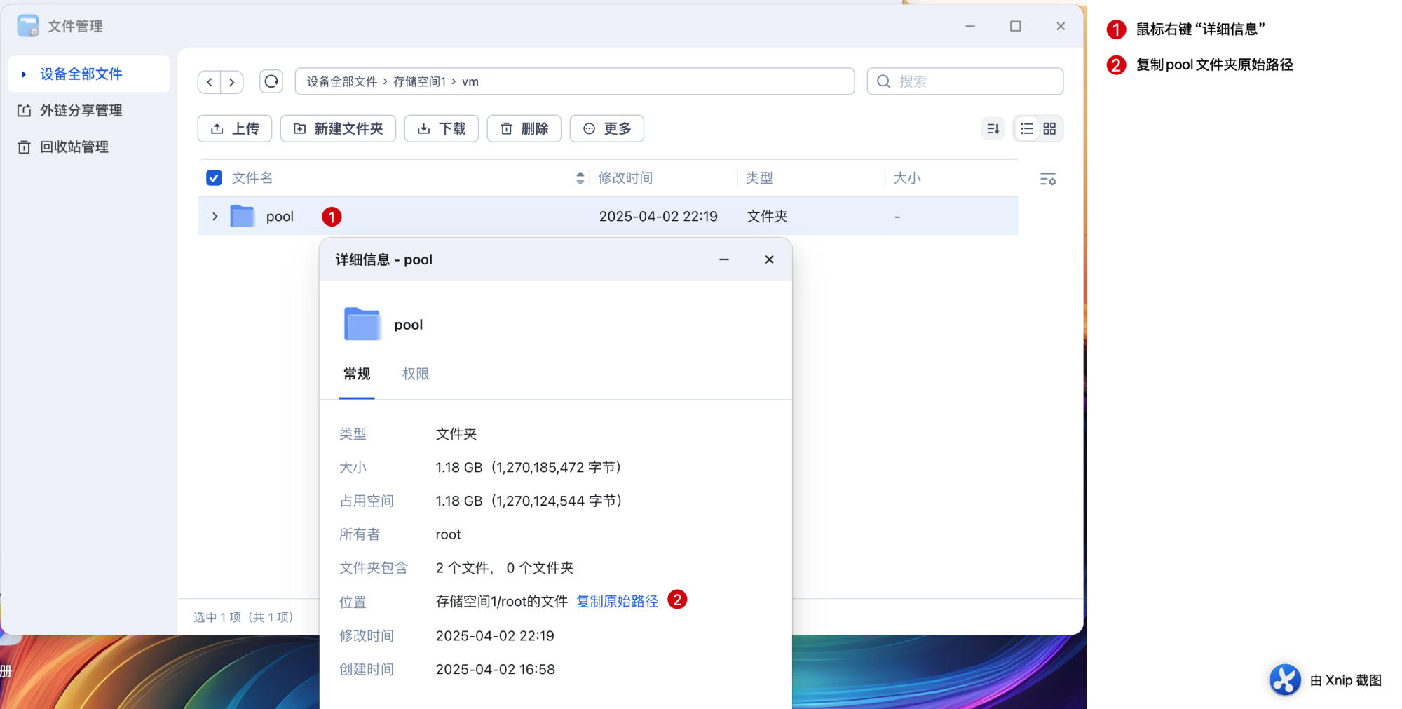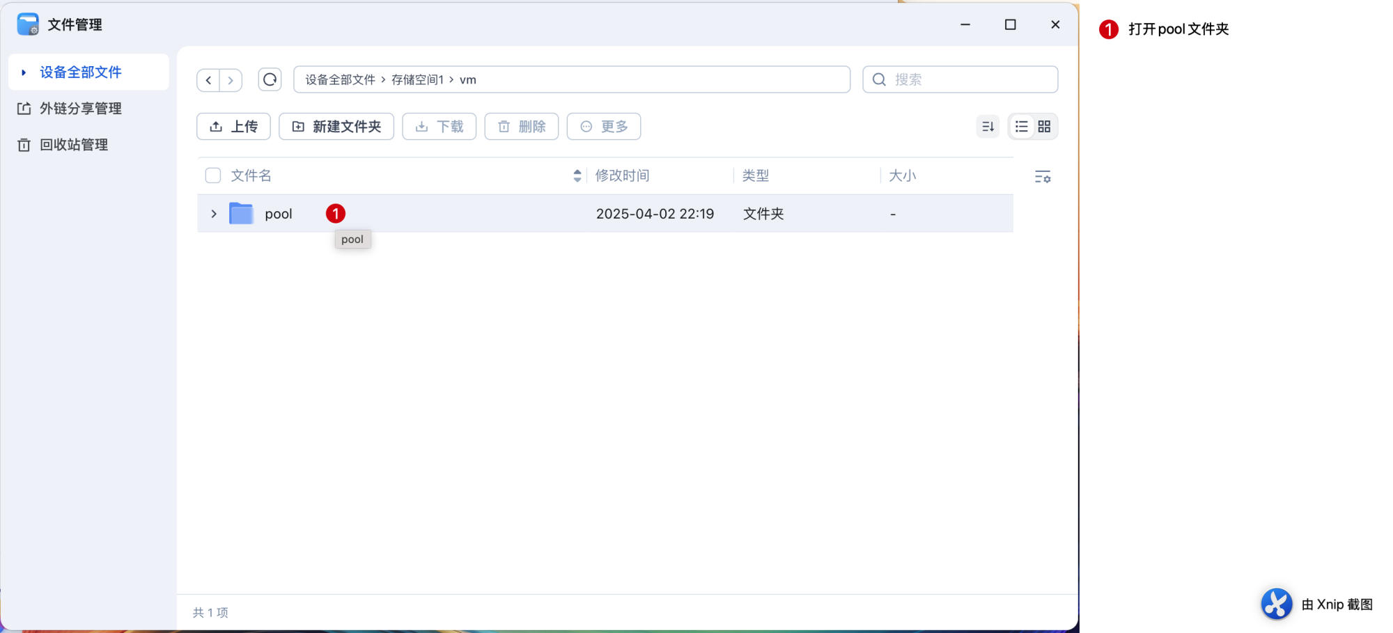 - 打开飞牛的文件管理>>管理员视角>>找到VM文件夹下的POOL文件夹。