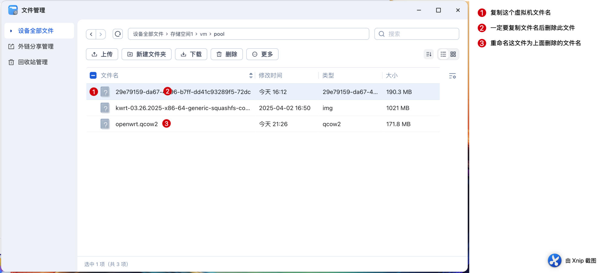 - 先复制虚拟机创建时自动生成的文件名,一定要复制好后再把文件删!。然后把openwrt.qcow2重命名为删除的虚拟机文件名,如:29e79159-da67-4996-b7ff-dd41c93289f5-72dc